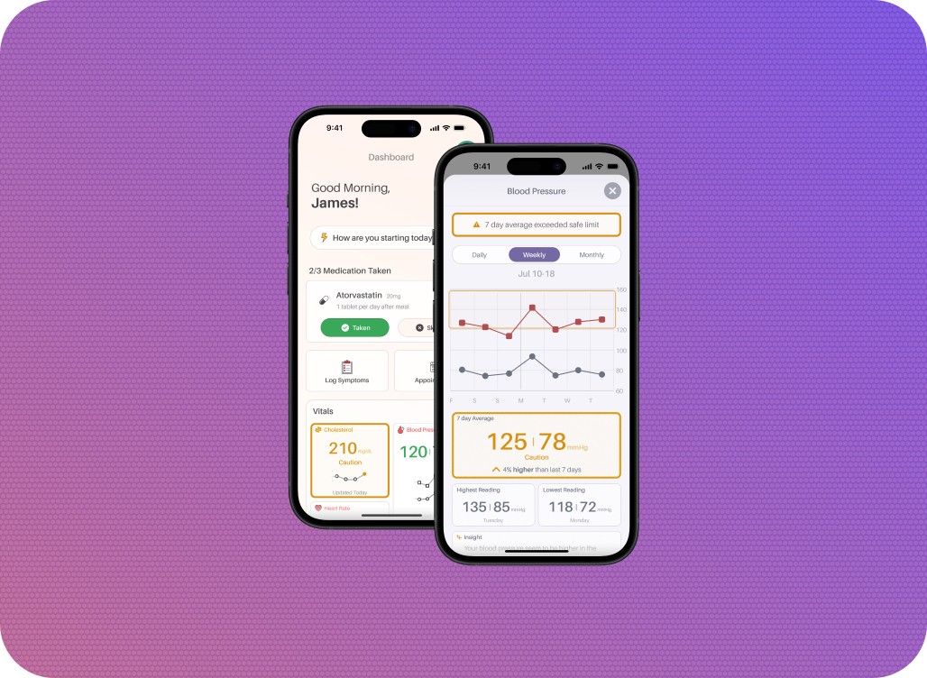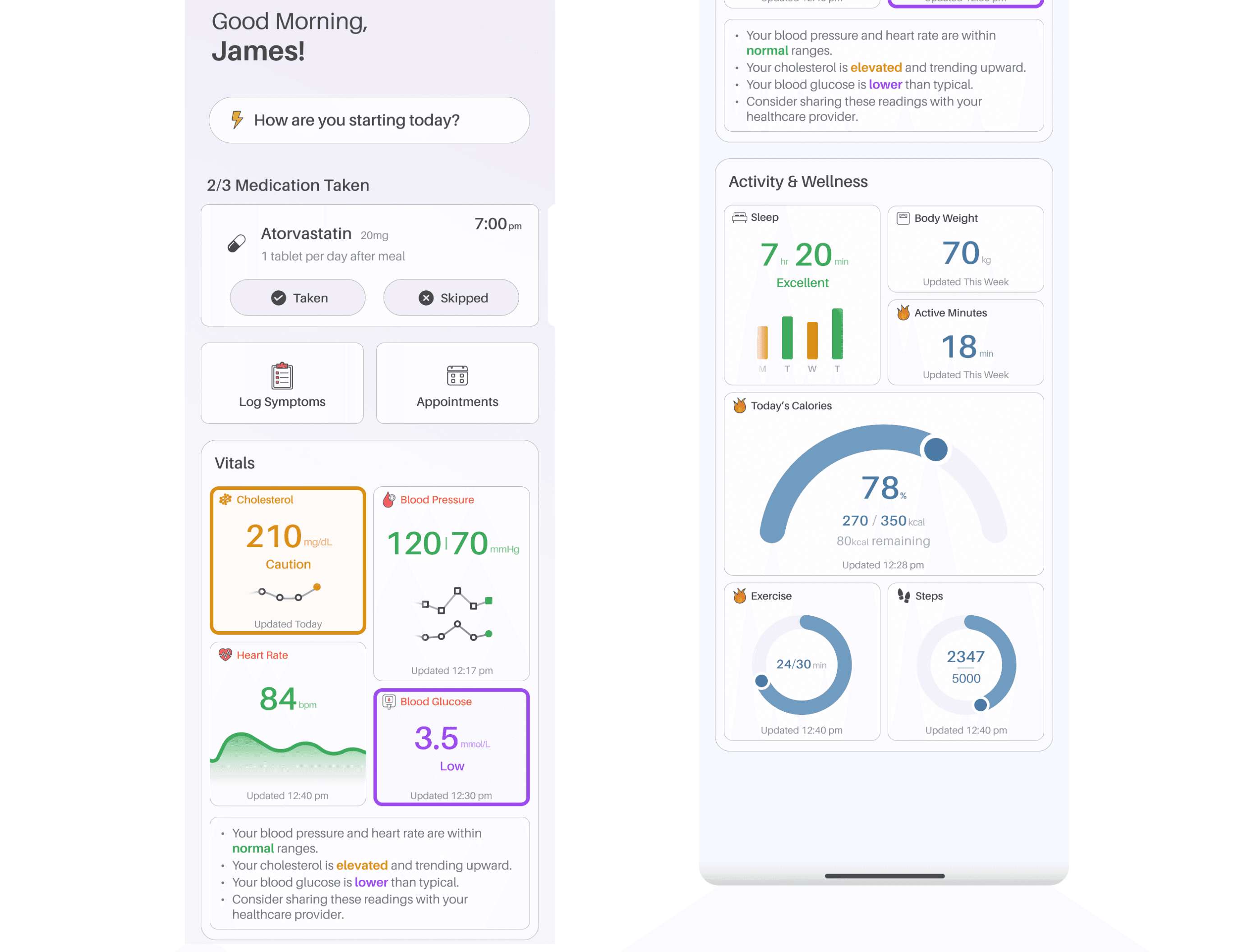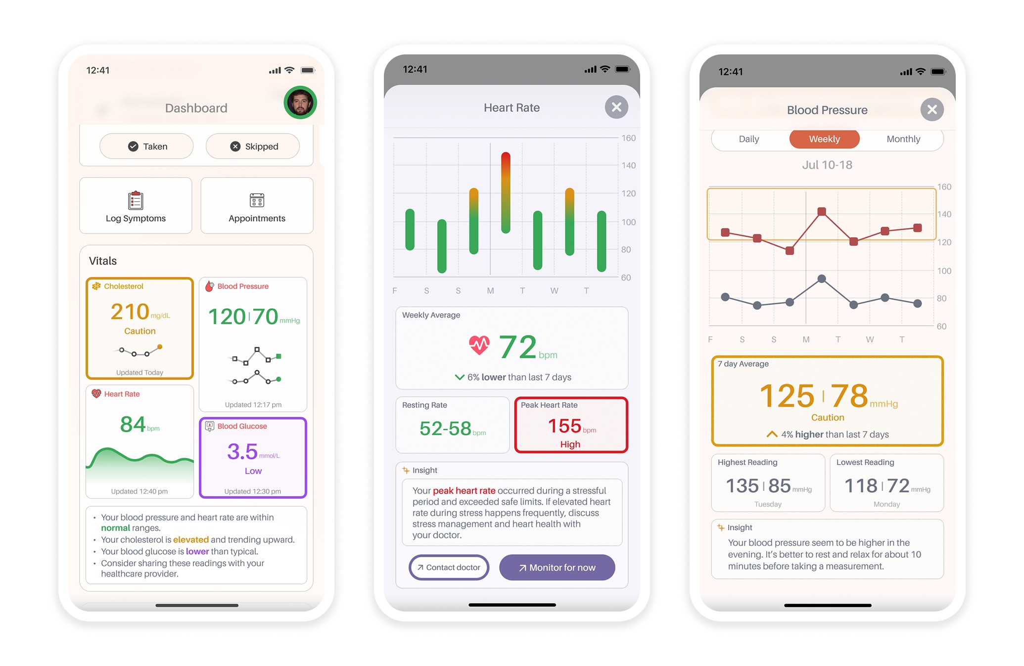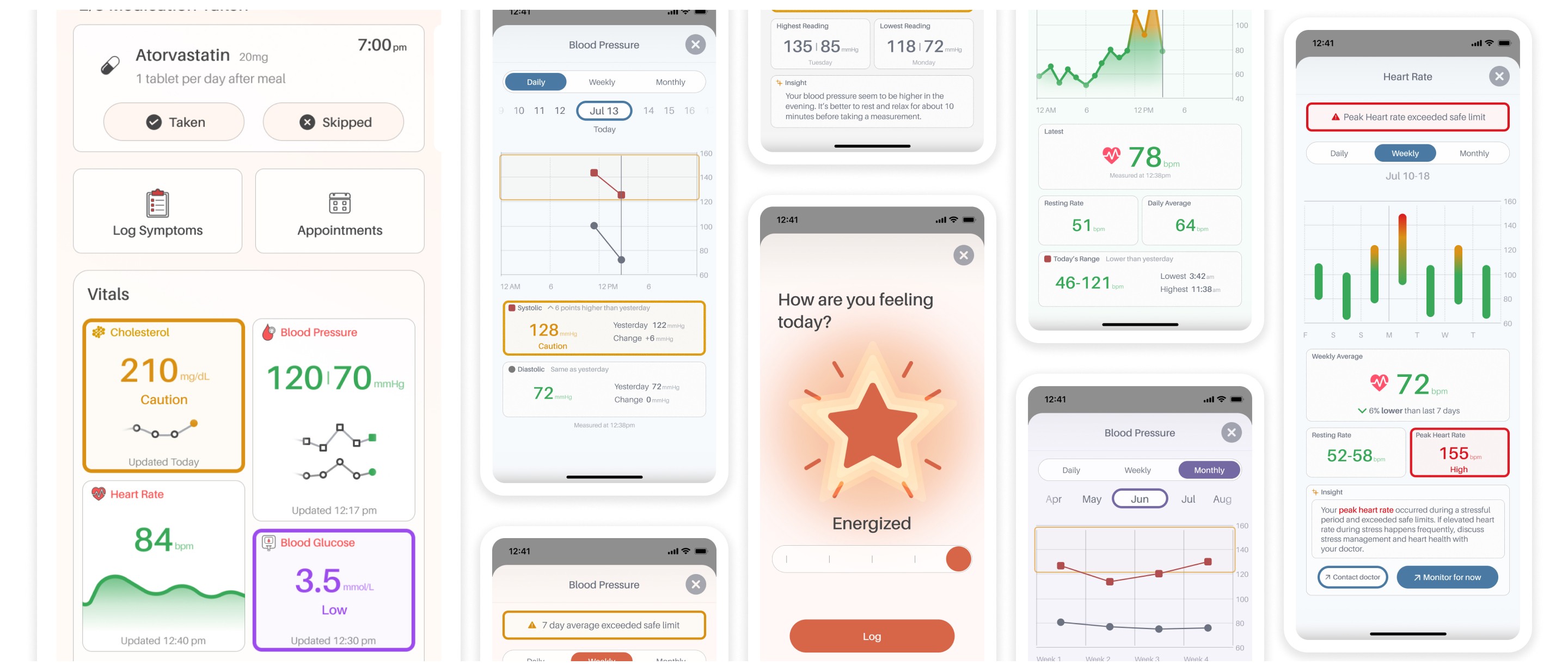 I designed a health monitoring platform for adults managing cardiovascular conditions like hypertension and heart disease. The app pulls data from wearables and connected devices, then translates that information into something actually useful, insights people can understand and act on instead of just numbers on a screen.