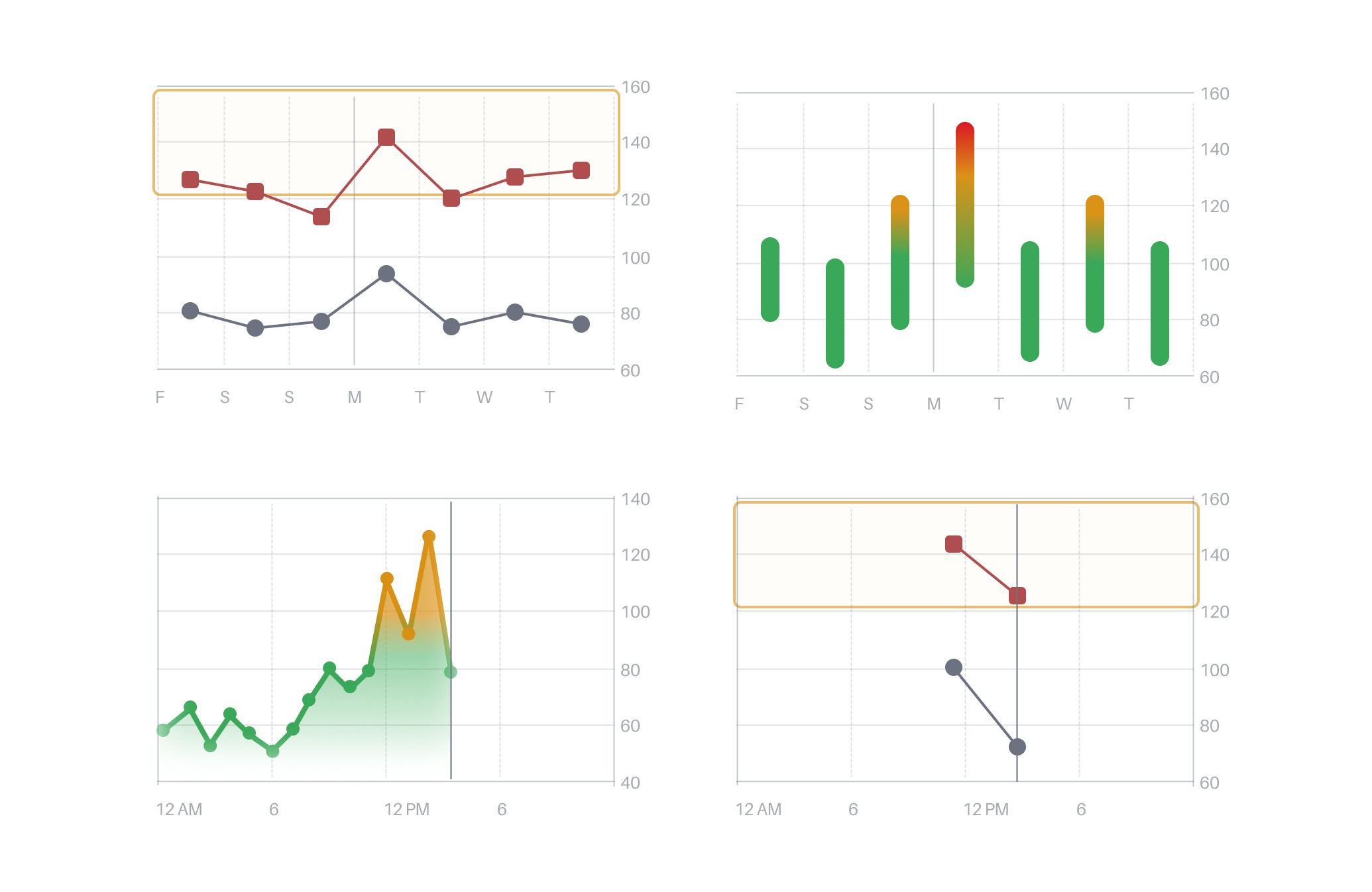For visualizations like the weekly heart rate view, I used gradient-based colour coding that maps to actual clinical thresholds. Green bars represent normal ranges, orange shows elevated levels, and red indicates concerning spikes. The colours are tied to medical significance, so users can scan the graph and immediately understand which days were fine and which weren’t.