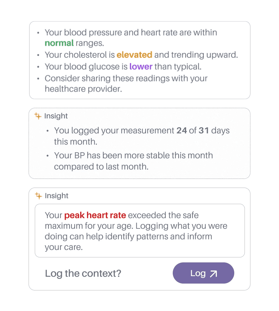 Every piece of data comes with an explanation. Instead of the the app showing that your heart rate spiked, it tells you it happened during a stressful period, explains why that matters, and suggests whether you should monitor it or talk to your doctor. It's about translating medical data into language that makes sense without a medical degree.